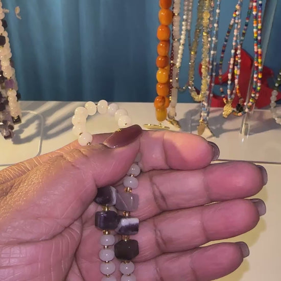 White jade’s calm energy meets the rich violet of amethyst cubes. Minimal, modern, and meaningful.