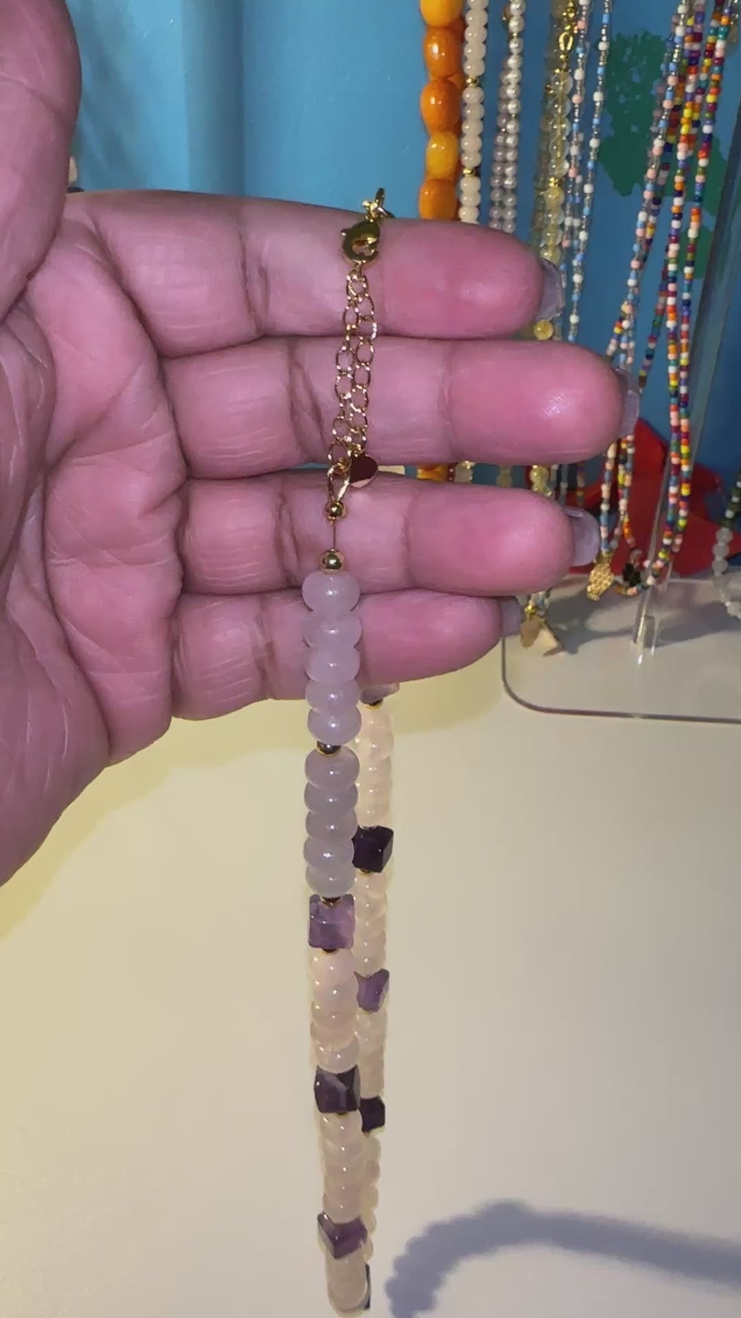 Materials: 8mm rose quartz, 8mm amethyst cubes, gold plated extender chain with a gold plated lobster clasp